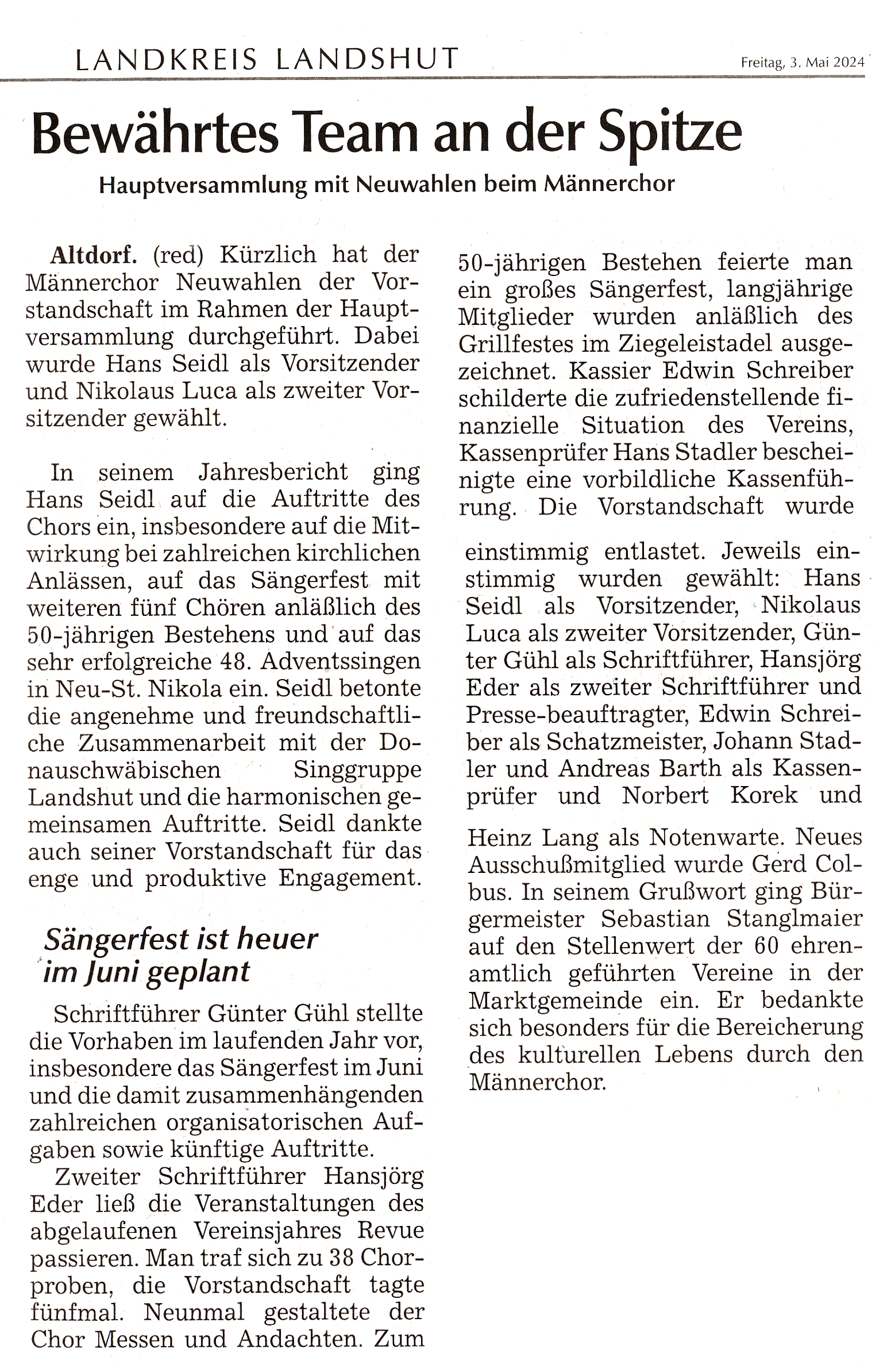 Landshuter Zeitung 1. Juli 2024, Bericht zum 24. Sängerfest
